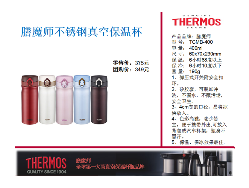 膳魔师不锈钢真空保温杯 价格:349元